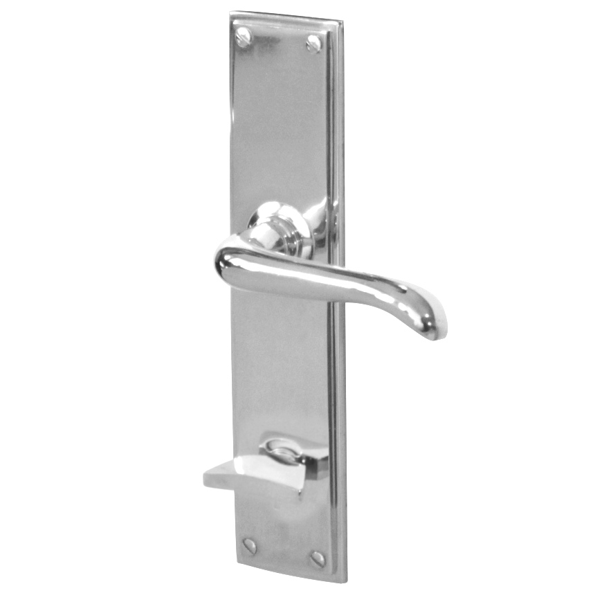 Komplett trycke som levereras med 8 mm fyrkantpinne och bussning för att passa både äldre och moderna lås. Dessutom levereras handtaget med gjuten långskylt i massiv förnicklad mässing med måtten 181 x 43. Du kan också välja till samma långskylt med WC-lås i rullgardinsmenyn. Det här handtaget fungerar också utmärkt som ytterdörrslås om du har låskista med äldre standard, det vill säga handtaget överst och nyckelhålet underst.