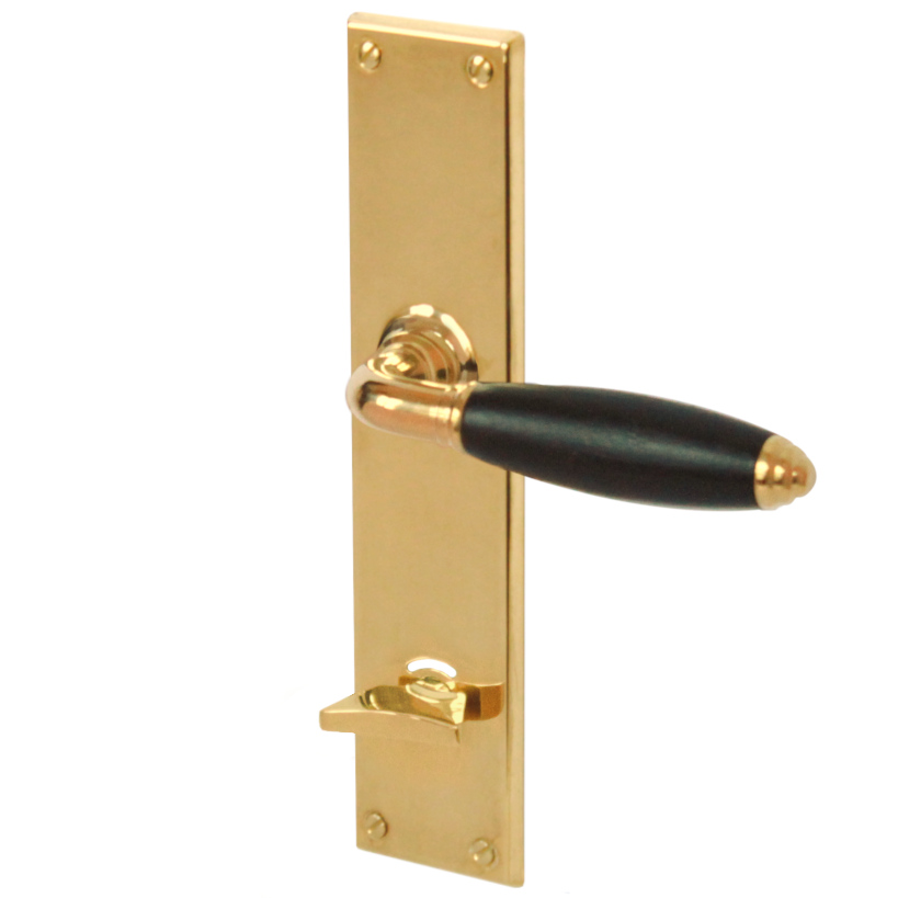 Komplett trycke som levereras med 8 mm fyrkantpinne och bussning för att passa både äldre och moderna lås. Dessutom levereras trycket med pressad långskylt i olackad  mässing med storlek 181 x 43 mm samt skruv. I rullgardinsmenyn kan du också välja att få den här långskylten med WC-vred.