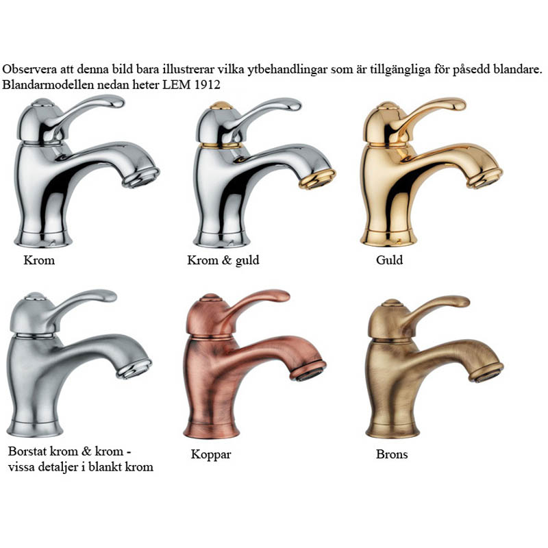Blandaren finns i ett flertal olika ytbehandlingar - krom, krom/guld, guld, åldrad koppar (ej äkta kopparfärgton), bronserad (kallas ibland även åldrad mässing) och borstat krom/krom. De vita detaljerna är tillverkade av s.k. Recine som är en imitation av porslin.