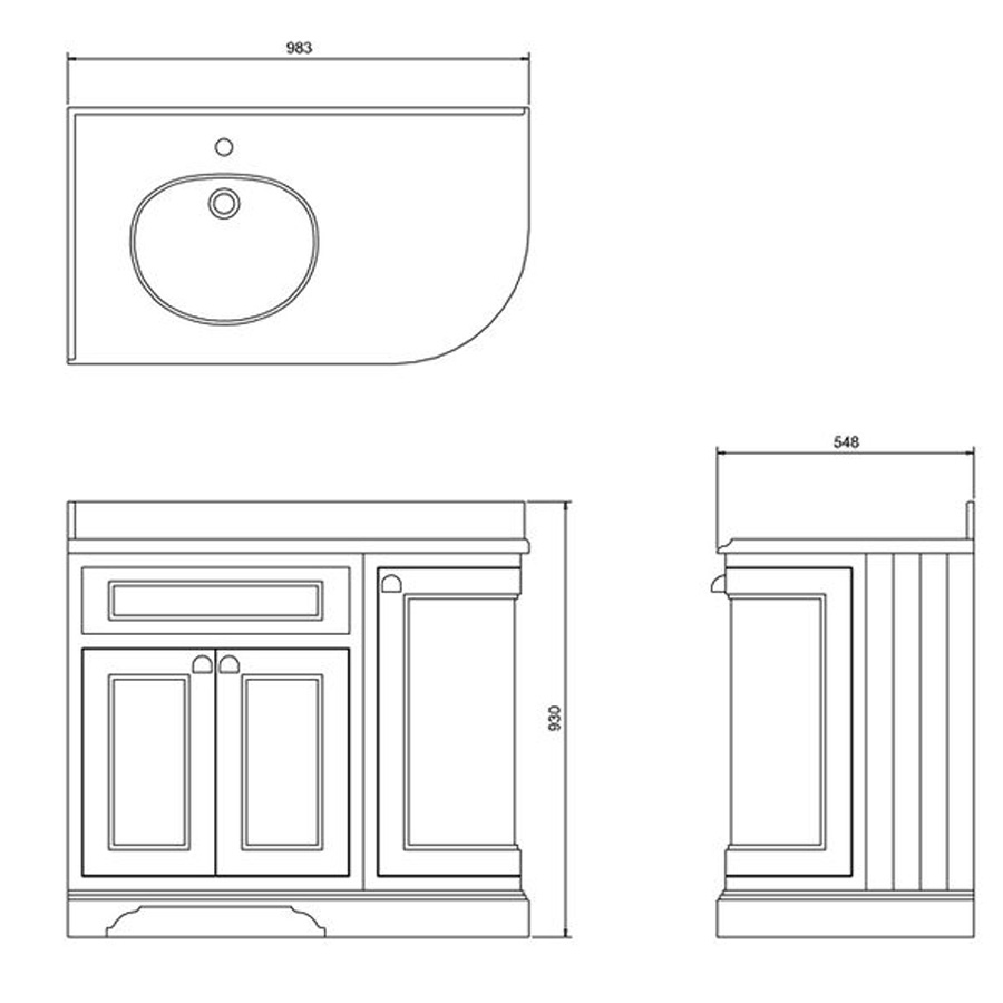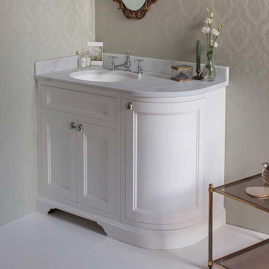 Rundad badrumskommod från Burlington avsett för att ställas i ett vänsterhörn, cirka 100 centimeter brett. Kommoden kombineras med Minerva-skiva med inbyggda handfat. Minerva är en form av tåligt kompositmaterial.