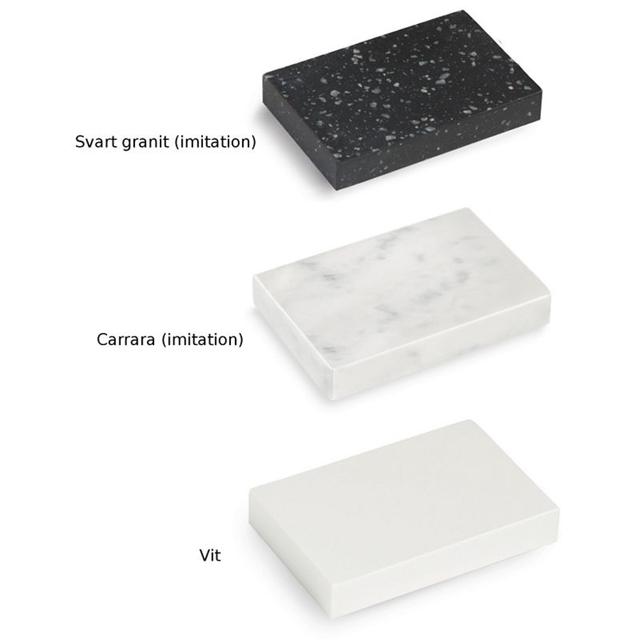 Kommoden kan beställas i flera olika färger – matt vit, matt grön, grå eller blå. Den kombineras sedan med en Minerva-skiva som finns i vitt, Carrara eller svart granit. Handtagen kommer som standard i kromat utförande men det går att beställa till handtag i guldfärg.