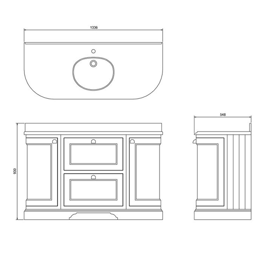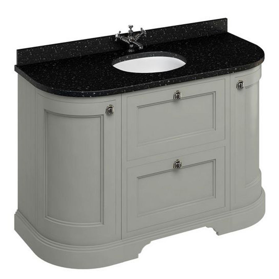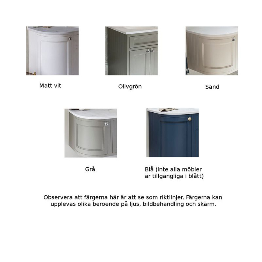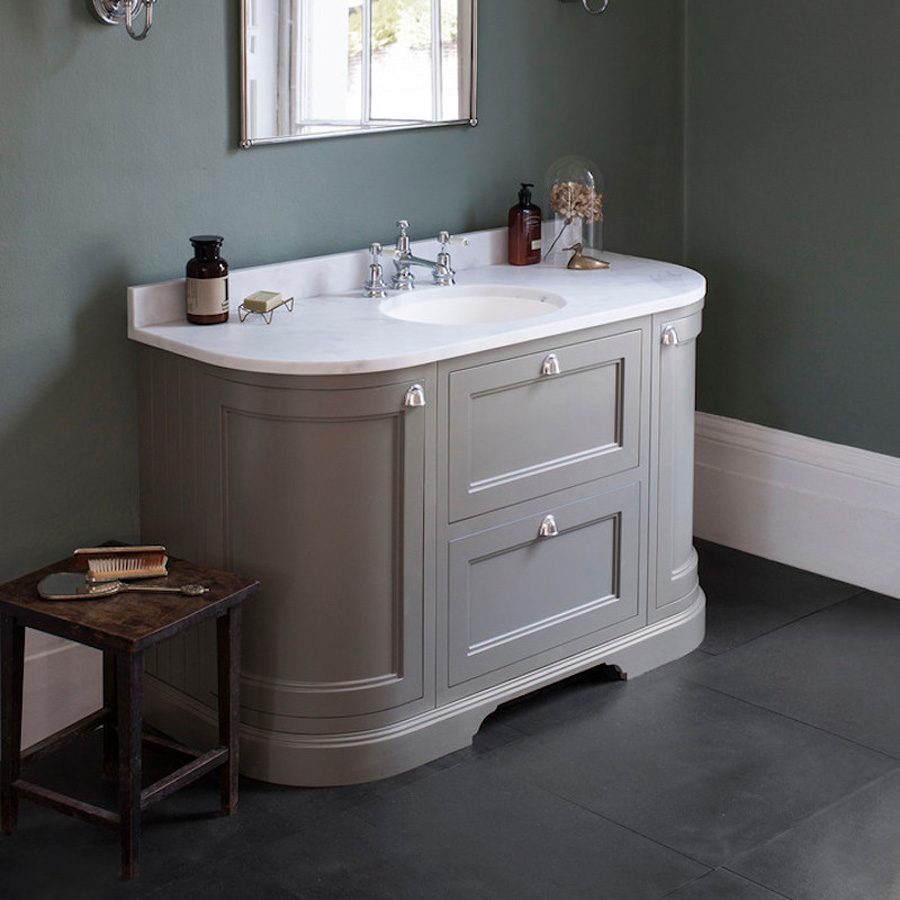 Rundad badrumskommod från Burlington cirka 134 centimeter brett. Kommoden kombineras med Minerva-skiva med inbyggda handfat. Minerva är en form av tåligt kompositmaterial.