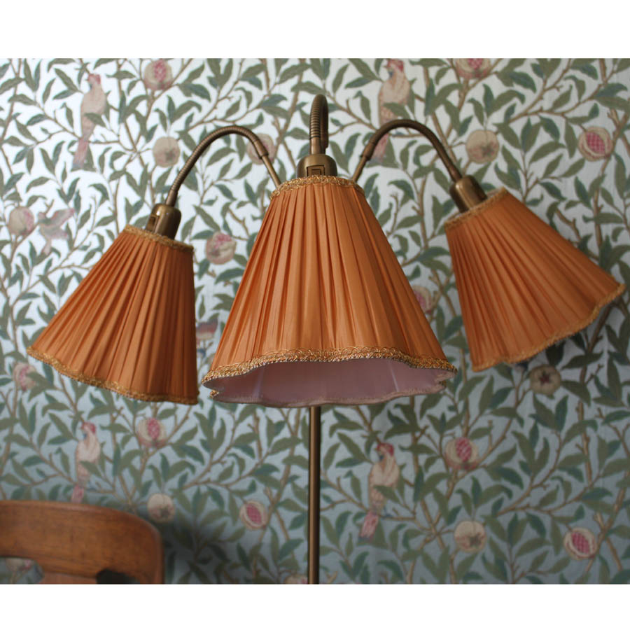 Trearmad golvlampa med guldfärgade skärmar