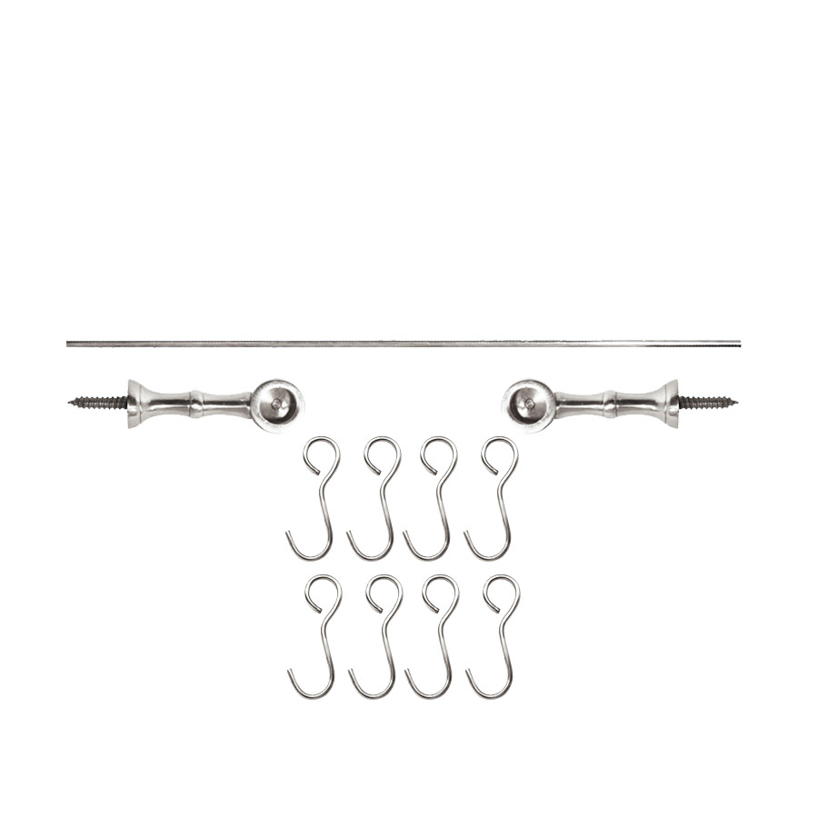 Ett köksstångsset bestående av en 115 centimeter lång stång, två ändfästen och åtta S-krokar i förnicklad mässing. Stången är 10 mm i diameter och med de två hållarna med ett utstick på 48.5 mm från vägg är det här en utmärkt köksstång när du vill att stången ska komma ganska nära väggen.