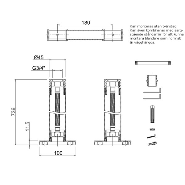Ståndarben med tvärstag för badkarsblandare, krom