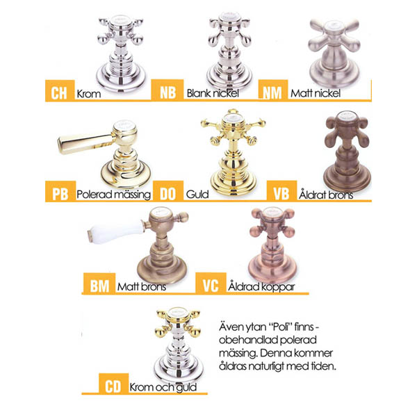 Köksblandaren finns i ett flertal olika ytbehandlingar såsom krom, blankt nickel, borstat nickel (kallas även matt nickel), matt brons (kallas även åldrad mässing), åldrat brons, guld, guld och krom blandat, polerad mässing med skyddslack (oxiderar ej), polerad mässing utan skyddslack (oxiderar naturligt) och åldrad koppar (ej äkta kopparton).