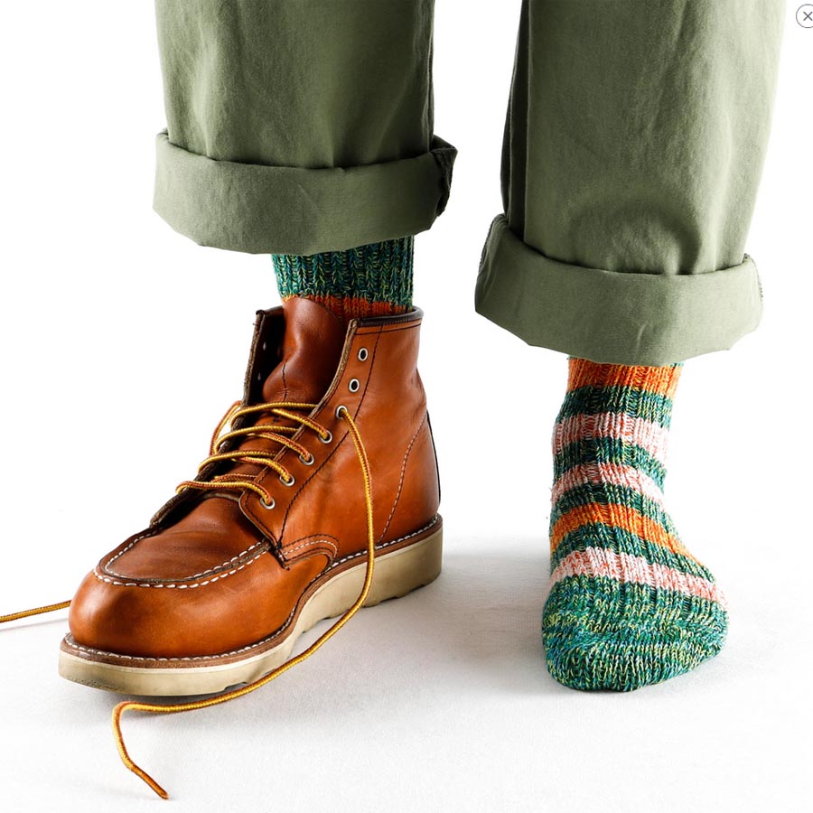 Brooklyn Green Socks has the background in green with stripes two in orange and the others in white.