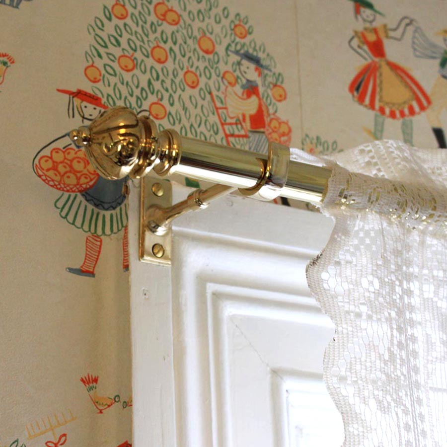 Vi har två serier med gardinstänger: Odessa för det stora fönstret och Bistro för det mindre. Bägge serierna finns i både olackad mässing och förnicklat.