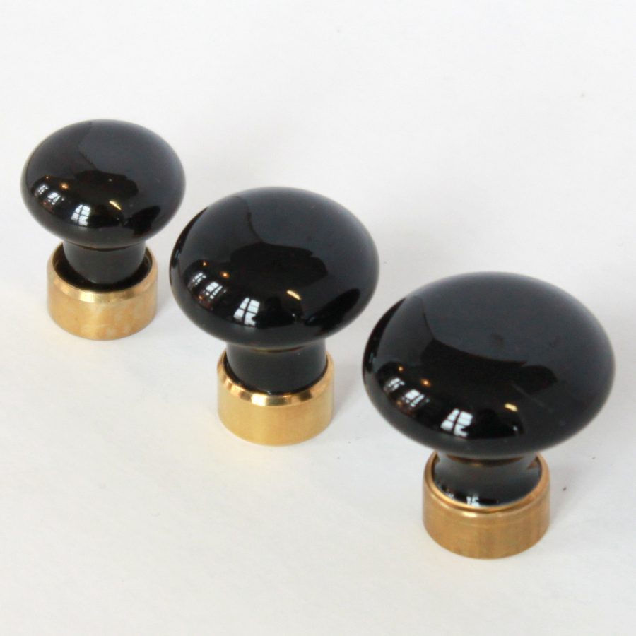 Svart porslinsknopp med mässingsfäste i tre olika storlekar