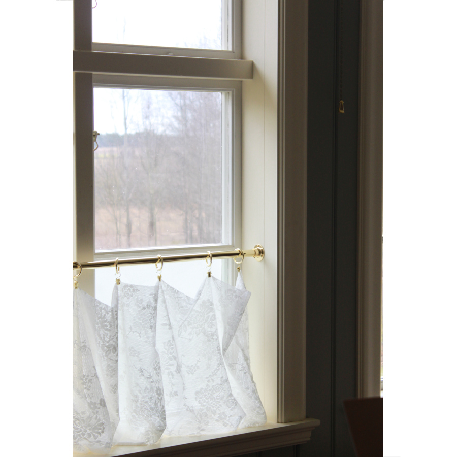 Vi har två serier med gardinstänger: Odessa för det stora fönstret och Bistro för det mindre. Bägge serierna finns i både olackad mässing och förnicklat.
